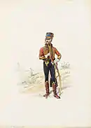 Pelisse rouge écarlate, dolman bleu de roi, parements et retroussis écarlates. Culotte bleu de roi, ganses jaunes. Surtout et gilet drap bleu. Manteau bleu. Schako feutre noir doublé d’écarlate ; sabretache écarlate, chiffre du roi formé avec une ganse blanche sur un fond jaune et bordé d’un galon de même couleur.