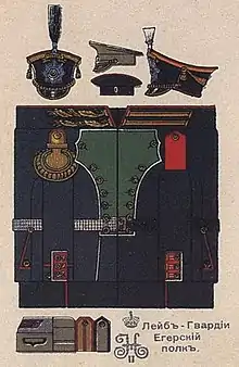 Le Bataillon des Chasseurs de la Garde fut créé en 1796 à partir d'unités de chasseurs prélevées dans les régiments Préobrajensky, Izmaïlovski et du détachement de Gatchina[4]. Ce bataillon prit le nom de régiment des chasseurs de la Garde (Ieguerski, emprunt à l'allemand Jäger - chasseur), le . Il se composait de quatre compagnies et de deux bataillons. En 1807, le régiment fut formé de trois bataillons et quatre compagnies. le , après restructuration, il se divisa en trois bataillons (chaque bataillon dispose d'une compagnie de grenadiers et trois de chasseurs).
