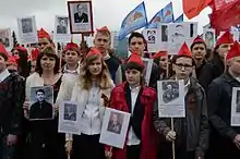 Toutefois, à partir de 2017, les portraits de Staline sont en tête du cortège et visibles, car glorifié désormais comme l’architecte de la Victoire (malgré les 27 millions de morts que le [8]conflit engendra réduit par la propagande à 7 millions[14] et l'ordre 227 signé par ce dernier le 28 Juillet 1942 interdisant tout pas en arrière sous peine pour le soldat soviétique d'être fusillé par les troupes de la police politique, le NKVD, futur KGB)[14].
