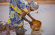 Pendant la saison sèche, une femme lave son riz dans une eau souillée.