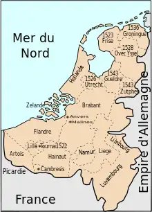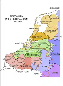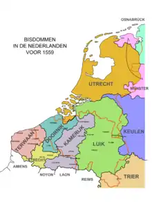 Ce qui vaut pour cette organisation politique n'existe pas sur le plan religieux : les diocèses sont restés presque intacts depuis l'époque mérovingienne[2] alors que la population est devenue nombreuse. Le territoire des Dix-Sept Provinces est sous l'autorité de six évêchés différents qui ne correspond en rien à ces terres : seulement quatre évêchés leur sont propres, Cambrai, Tournai, Arras et Utrecht[3],[4]. Non seulement la plus grande partie des Dix-Sept Provinces est soumise à deux évêchés étrangers, mais les quatre évêchés propres aux Pays-Bas belgiques relèvent eux-mêmes de deux métropoles étrangères : les uns de l'archidiocèse de Cologne et les autres de celui de Reims[5]. L'autorité spirituelle du duché de Brabant est partagée par les évêques de Liège et de Cambrai. La situation est pire dans le duché de Luxembourg qui se trouve soumis à six prélats différents[6]. Cette situation a des retombées négatives à la fois politiques et religieuses :