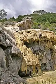 - La fontaine pétrifiante de Réotier. Un phénomène chimique est à son origine : l'eau chaude chargée en calcium remonte par un système de failles associées à la Durance. Une fois à l'air libre, les réactions chimiques la chargent en carbonate de calcium qui trop lourd se dépose en couches successives pour former des draperies de concrétions. Elle est située sur la même ligne que la source du plan de Phazy, à 2 km de là sur la grande faille de la Durance[25].