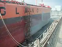 - Une réfection totale de la peinture afin de diminuer la corrosion et l'accrochage de parasites (mollusques, algues, etc.) sur la coque, ces derniers pouvant augmenter la consommation et provoquer un ralentissement de 10 % (on utilise dans ce cas une peinture dite « anti-fouling »). Cette réfection est précédée d'un piquage et d'un décapage des tôles. Ces opérations peuvent être effectuées de façon manuelle ou à l'aide de machines électriques ou pneumatiques. Elles peuvent mettre en œuvre la projection d'eau sous haute pression (150-500 bars) pour le nettoyage, de l'eau sous très haute pression THP (2000 à 2500 bars) pour le décapage à nu de l'acier de la coque, un système appelé grenaillage (shot-blasting) ou le sablage (grit blasting) qui projette un matériau abrasif propulsé par de l'air comprimé entre 7 et 10 bars. La combinaison eau + matériau abrasif, alliant ainsi vitesse et absence de poussières n'est utilisé que dans des cas spécifiques.