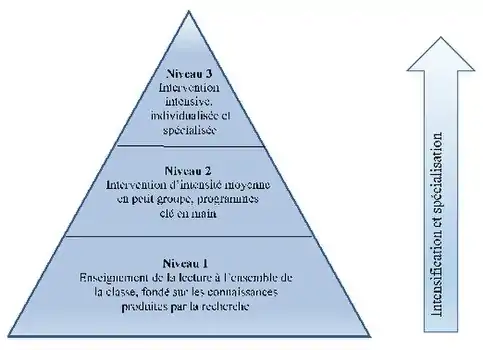 L’idée centrale de la procédure RAI est de proposer différents niveaux d’intervention d’intensité croissante, généralement symbolisés par une pyramide. La base représente ce dont bénéficie l’ensemble des élèves et le sommet dont bénéficie une petite partie d’entre eux. Le nombre de ces niveaux et leur caractérisation varie selon les façons d’opérationnaliser le principe de la RAI. La figure ci-dessous, adaptée de Haager, Klinger et Vaughn illustre le fonctionnement de la réponse à l’intervention dans le domaine de l'enseignement-apprentissage de la lecture.