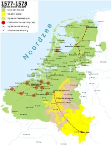 La résistance à la République de Gand est d'abord venue des catholiques des provinces francophones du sud, les Malcontents (également appelés avec mépris paternosterknechts à Gand), dirigés par Emmanuel de Lalaing, entre autres. Il est le premier à prendre Menin le . Le , Courtrai tombe aux mains des Malcontents, puis Deinze quelques mois plus tard. Le gouverneur Alexandre Farnèse finit par incorporer le parti malcontent dans son armée et commence la reconquête des Flandres. Audenarde tombe le [4]. L'année suivante Alost, Dunkerque et Nieuport sont perdus et le siège d'Ypres est lancé.