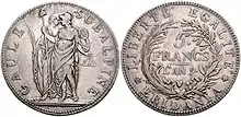 Pièce de 5 francs en argent Gaule subalpine, An 9 (1800-1801), gravée par Amedeo Lavy.