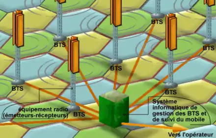 Un grand nombre d'émetteurs à courte portée sont installés, chacun ne couvrant qu'une zone géographique bien délimitée appelée une « cellule » (zone couverte par une antenne). De là, le terme « téléphonie cellulaire ». La portée moyenne varie de 1 à 30 km. Ainsi, les téléphones reçoivent les ondes radio d'une station de base (BTS) et lui répondent pour indiquer s'ils souhaitent s'y attacher. Si celle-ci accepte, elle retient le numéro d'identité de l'appareil mobile (n° IMSI stocké dans la carte SIM), lui affecte des ressources radio et reprend le contact si un appel pour ce téléphone lui parvient ou si le téléphone en effectue un. Ceci permet de réutiliser des milliers de fois les mêmes fréquences hertziennes dans un seul pays.