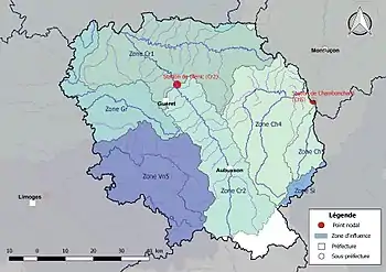 Leur détermination repose principalement sur l’observation des équilibres ou déséquilibres actuels et sur l’expérience des situations de crise antérieures. Le département de la Creuse est découpé en six zones nodales se référant à six points nodaux dont un seul est dans le département. Leurs caractéristiques sont les suivantes[22] :