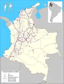 Le réseau principal, appelé red nacional de carreteras[1], est constitué notamment des axes routiers troncales et transversales permettant l'accès aux capitales départementales. Il a pour fonction de base de relier les principales zones de production et de consommation de la Colombie et avec d'autres pays. Ces routes doivent être asphaltées[4].