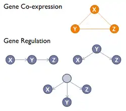 La direction et le type de la relation de co-expression ne sont pas définis dans les réseaux de co-expression de gènes, au contraire d'un réseau de régulation génique (GRN), où un arc orienté reliant deux gènes représente un processus biochimique comme une réaction, une transformation, une interaction, une activation ou une inhibition[3]. Par rapport à un GRN, un GCN ne permet pas de déduire les relations de causalité entre les gènes et dans un GCN les arcs indiquent seulement une corrélation d'expression de ces différents gènes[4]. Les modules ou les sous-graphes fortement interconnectés dans les réseaux de co-expression de gène (GCN) correspondent aux groupes de gènes ayant une fonction similaire ou participant à un processus biologique commun[3].