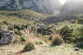 Le versant sud du promontoire rocheux présente une pente sèche couverte de steppe méditerranéenne composée d'ampelodesme (Ampelodesmos mauritanicus), de figuiers de Barbarie (Opuntia ficus-indica) et d'arbustes clairsemés : euphorbe arborescent (Euphorbia dendroides), calicotome épineux (Calicotome spinosa) et germandrée petit-chêne (Teucrium chamaedrys).