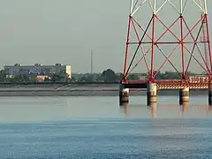 Le barrage du réservoir de Riga est traversé par la route A5 qui fait également partie de la route européenne 67 sur ce tronçon. Il y a un pylône de ligne électrique au milieu du réservoir, qui supporte deux lignes de 330 kV reliant Salaspils à Jelgava et Salaspils à la centrale hydroélectrique de Riga. La distance entre les deux rives du réservoir à cet endroit est d’environ 1 km.