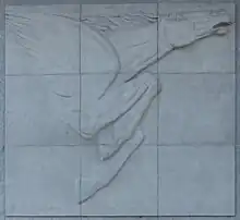 Oscar De Clerck, artiste sculpteur cubiste belge, a créé ici un bas-relief en pierre bleue, représentant un cheval ailé, qui s'intègre au soubassement de l'édifice, fait de petit granit.
