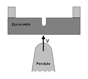 Une éprouvette entaillée est placée sur deux appuis. Le pendule est lâché d’une hauteur déterminée de façon à frapper l’éprouvette avec une vitesse entre 1 et 4 m/s. La hauteur de remontée du pendule après le choc permet de déterminer l’énergie nécessaire pour rompre l’éprouvette.