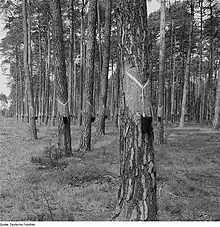 Les pinèdes sont exploitées de temps immémoriaux pour cette résine qui prend différents noms selon qu'elle coule sur l'écorce de l'arbre. Récoltée elle prend le terme de « gemme ». Débarrassée de son eau et clarifiée elle prend le nom de « térébenthine[14] ». La térébenthine distillée se divise en sa partie solide, la « colophane », et sa partie volatile, l'« essence de térébenthine ». La récolte se faisait par incisions successives de l'écorce, ce que l'on appelle « gemmage ». Le pin arrivé à maturité était gemmé à mort puis coupé. Le tronc pouvait encore – par pyrolyse – produire du goudron de pin, du noir de fumée, du charbon de bois, ou être utilisé comme bois de sciage. Les copeaux (galips) obtenus lors des incisions du gemmage, de même que la souche (bois gras), pouvaient faire l'objet de processus séparés (distillation ou pyrolyse) et produire de l'essence de térébenthine, de la colophane ou du goudron.