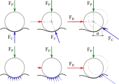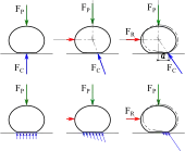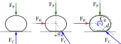 Soit un cylindre aplati sous l'effet d'un effort presseur et soumis à un effort moteur (force parallèle au plan, en rouge sur l'image ci-contre). Faire tourner le cylindre revient à le renverser ; il faut donc fournir une force suffisante, comme pour faire tomber un objet. D'un point de vue global, il faut que le point d'application de la force de contact plan/cylindre FC soit au bord du plat ; d'un point de vue microscopique, l'action de contact est une force répartie (pression), et il faut la concentrer du côté du bord. En effet, au moment du basculement, le reste de la surface de contact « décolle », le sol n'exerce pas d'action sur cette partie.