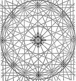 Le cercle est divisé en seize parties égales et les cours sont indiqués par des lignes rouges raccordant chacun des sommets qui divisent le cercle avec les autres sommets opposés mais avec une cadence de sommets alternées (pair: oui, impair:non) avec un total de lignes qui relient chaque sommet avec 7 de ceux qui restent en laissant sans connexion les huit autres. Les lignes de la grille sont appelées "lignes des vents" ou aussi "lignes des cours"[5].