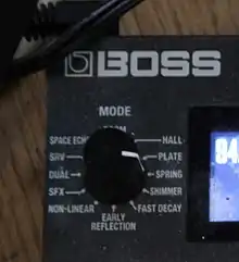 Les pédales d'effet, principalement utilisées avec des guitares électriques, permettent de reproduire le son de la réverbération à ressorts typique des amplificateurs des années 1960, mais permettent également d'obtenir d'autres types de réverbération avec un contrôle plus important des différents paramètres de l'effet[19], notamment le pre-delay et le decay[20]. Puisque la réverbération est censée reproduire l'atmosphère d'une pièce, elle est généralement placée à la fin après tous les autres effets[19].