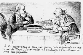 En 1868, l’empereur Dom Pedro II congédia le cabinet ministériel libéral et convoqua un cabinet conservateur, qui occupa ensuite le pouvoir jusqu’en 1875. Après qu’eut éclaté la révolte de Quebra-Quilos, la faction libérale fut accusée de vouloir exploiter ce soulèvement pour discréditer le gouvernement conservateur alors au pouvoir. L’on se plaisait à citer l’exemple d’un émeutier qui avait cherché refuge au logis d’un dirigeant libéral connu, le major de cavalerie Antonio Guedes e Alcoforado, et s’était placé sous sa protection[59]. Les dirigeants libéraux faisaient observer que le major Alcoforado en recueillant un blessé ne rejoignait pas pour autant les rangs ennemis, mais faisait simplement « œuvre de charité ». Les libéraux étaient restés neutres, affirmaient-ils, et dans cet esprit s’étaient confinés à leurs domiciles, n’aidant ni les autorités ni les émeutiers. Dans un manifeste officiel paru dans le journal O Despertador, le directoire du Parti libéral se déclara complètement étranger aux mouvements populaires survenus dans la Paraiba[60]. En réalité, même si certains d’entre eux déclarèrent que le mouvement de Quebra-Quilos était « une manière violente et rude dont le peuple ignorant manifeste contre le gouvernement qui l’opprime et le réduit en esclavage »[61], les libéraux étaient, tout autant que leurs rivaux politiques, des patriciens et à ce titre tentaient eux aussi de préserver leurs clients du service militaire rendu obligatoire par une nouvelle loi de conscription (voir ci-après)[62]. Néanmoins, plusieurs libéraux furent emprisonnés[63].