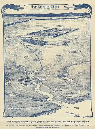 Dès le , un corps expéditionnaire est constitué, sous le commandement du vice-amiral britannique Lord Seymour, à la tête d'une petite armée de 2 100 hommes environ[21]. L'armée parvient à Tianjin (alors orthographié Tien-Tsin en France) mais elle est ensuite ralentie par la destruction du chemin de fer. Face à une forte opposition, il est contraint de se replier le ne cherchant pas à progresser davantage à ce moment-là car de faux rapports indiquent que tous les habitants des légations ont été massacrés.