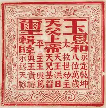 Par ailleurs, à partir de 1853, Hong Xiuquan cesse de s'impliquer activement dans la conduite des affaires : on parle même de chef « invisible ». Ce changement dans la direction du mouvement s'opère au bénéfice de Yang Xiuqing, le « Roi de l'Est » et « Conseiller militaire » ; celui-ci cumule en fait les pouvoirs de général en chef de l'armée Taiping et de premier ministre, au travers de son titre de « Seigneur des 9 000 ans »[31]. Hong Xiuquan ne règne plus que par des proclamations écrites essentiellement centrées sur des questions religieuses, à partir de son « palais du Roi céleste » à Nankin.