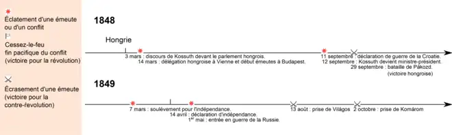 La révolution hongroise de 1848 est l'une des nombreuses révolutions de cette année et est étroitement liée à la révolution autrichienne de 1848. Cette révolution, au sein du royaume de Hongrie, a progressé en une guerre d'indépendance contre la domination des Habsbourg. Elle se donne pour objectif de rétablir les droits et libertés du peuple (Demos). Impulsée par un besoin de réformes agraires, la remise en question des droits féodaux et une volonté nationale, la révolution est menée par les classes moyennes des villes et des nobles. L'armée révolutionnaire de libération remporte initialement des victoires mais, en 1849, les insurgés sont écrasés par les armées autrichiennes et russes (corps expéditionnaire d'Ivan Paskevitch).