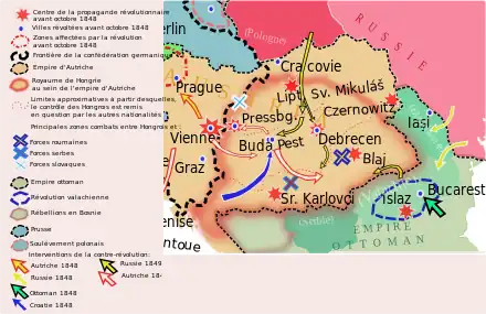 marque le revers de fortune de la révolution hongroise. Ainsi, les troupes russes prêtent assistance à l'armée autrichienne le , alors que celle-ci prépare une nouvelle offensive pour l'été. Dès lors, les autres États européens se désolidarisent de la révolution hongroise, alors que les armées autrichiennes et russes attaquent sur tous les fronts. Elles écrasent finalement la révolution hongroise[13].