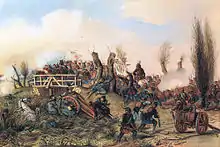 Sous les coups de boutoir autrichiens et russes, les Hongrois subissent une série de défaites. Le général autrichien Haynau se lance vers l'est, devant un ennemi désormais surclassé. Il remporte une série de victoires à Pered () et à Győr () (batailles de Komárom (en)) et reprend Buda et Pest en juillet[14]. Il poursuit ensuite son adversaire vers l'est. En Transylvanie, l'armée russe l'emporte lors de la bataille de Segesvár (en) le , puis celle de Debrecen le . De leur côté, les Autrichiens écrasent les révoltés à Szőreg (en) le , et à Temesvár (en) le 9, scellant le destin de la révolution. Kossuth se retire le 11. Le , les dernières unités hongroises capitulent à Világos[15],[16]. Ce n'est cependant que le que les derniers révolutionnaires hongrois capitulent face aux Autrichiens dans la forteresse de Komárom[16].