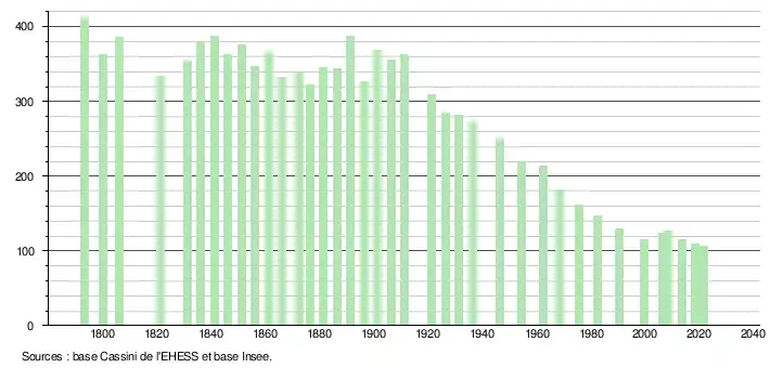 L'évolution du nombre d'habitants est connue à travers les recensements de la population effectués dans la commune depuis 1793. Pour les communes de moins de 10 000 habitants, une enquête de recensement portant sur toute la population est réalisée tous les cinq ans, les populations légales des années intermédiaires étant quant à elles estimées par interpolation ou extrapolation[13]. Pour la commune, le premier recensement exhaustif entrant dans le cadre du nouveau dispositif a été réalisé en 2008[14].