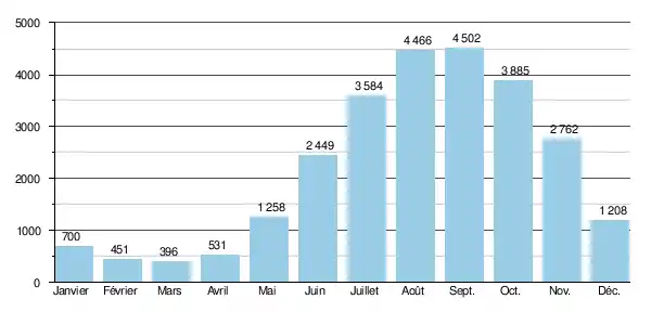 Le débit moyen mensuel observé en mars (minimum d'étiage) atteint 396 m3/s, soit onze fois moins que le débit moyen du mois de septembre (4 502 m3/s), ce qui témoigne de l'irrégularité saisonnière importante de la rivière. Sur la durée d'observation de 25 ans, le débit mensuel minimal observé a été de 196 m3/s (), tandis que le débit mensuel maximal s'élevait à 8 150 m3/s ().