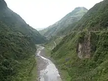 La rivière prend la direction de l'est près de la petite ville de Baños et perce la cordillère orientale par une profonde vallée entrecoupée de défilés et de cataractes, propice au rafting et aux aménagements hydroélectriques, notamment le barrage d'Agoyan situé à proximité de célèbres chutes qui portent le même nom. Cette vallée est aussi un passage routier qui comporte de nombreux ouvrages d'art