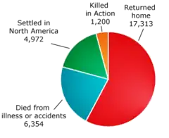 Brunswick a envoyé 5 723 soldats en Amérique du Nord, dont 3 015 ne sont pas rentrés chez eux à l'automne 1783[27][52]. Certaines pertes sont dues à la mort ou à la désertion, mais de nombreux Brunswickois se sont familiarisés avec l'Amérique pendant leur séjour dans l'armée de la Convention et, à la fin de la guerre, le Congrès et leurs officiers leur ont accordé la permission de rester[28]. Beaucoup avaient saisi l'occasion de déserter lorsque l'armée de la Convention avait traversé à deux reprises les colonies allemandes de Pennsylvanie (Pennsylvania Dutch) dans l'est du pays[53]. Comme le duc de Brunswick recevait une compensation des Britanniques pour chacun de ses soldats tués en Amérique, il avait tout intérêt à déclarer les déserteurs comme morts, dans la mesure du possible[52]. Le duc offrit même six mois de solde aux soldats qui restaient ou retournaient en Amérique[54].