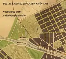 En 1866, un plan général d'aménagement du nord-ouest de Norrmalm est défini dans le cadre du plan Lindhagen. L'emplacement actuel de Röda bergen, du fait de son relief accidenté, est alors laissé intact. Pour le reste, on prévoit conformément aux idéaux urbains de l'époque, des avenues, des esplanades, des places en étoile et des rues rectilignes délimitant des lotissements rectangulaires.