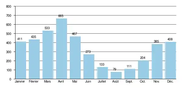 Les crues peuvent être assez importantes proportionnellement, bien sûr, à la taille modeste du bassin versant de la rivière. La série des QIX n'a pas été calculée, mais la série des QJX l'a bien été. Les QJX 2 et QJX 5 valent respectivement 2,6 et 4,2 m3/s. Le QJX 10 est de 5,2 m3/s, le QJX 20 de 6,2 m3/s, tandis que le QJX 50 se monte à 7,4 m3/s.