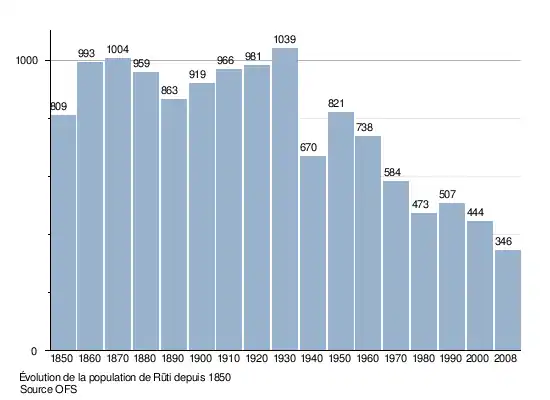 Le graphique suivant résume l'évolution de la population de Rüti entre 1850 et 2008[3] :