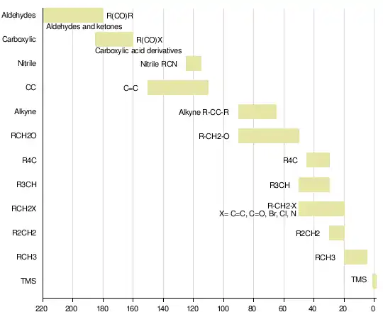 - il est plutôt aisé de faire la différence entre les groupes CH et CH3 grâce à leur intensité et au fait qu'un groupe CH3 (qui ne peut former qu'une seule liaison) se retrouve principalement dans la partie droite du spectre contrairement au groupe CH.