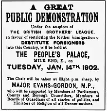 En 1905, le Royaume-Uni restreint l'immigration en vertu de la loi sur les étrangers. Bien que cette loi ne mentionne pas spécifiquement les juifs, « il était clair pour la plupart des observateurs » que la loi visait principalement les juifs fuyant les persécutions en Europe de l'Est[61]. Winston Churchill, alors député libéral, a déclaré que la loi faisait appel aux « préjugés insulaires contre les étrangers, aux préjugés raciaux contre les juifs et aux préjugés du travail contre la concurrence »[61].