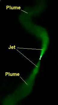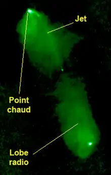 Certaines radiogalaxies montre une ou deux traits étroits connus sous le nom de « jets » (l'exemple le plus connue est la galaxie géante M87 se situant dans l'amas de la Vierge) provenant directement du noyau et se dirigeant vers les lobes radio (la direction du jet peut être déterminée, soit grâce au moment angulaire de l'axe du disque, soit grâce à l'axe de rotation du trou noir). Depuis 1970[9],[10], le modèle le plus accepté est que les lobes radio ou les plumes soient alimentés par des faisceaux de particules hautement énergétique et d'un champ magnétique venant à proximité du noyau actif. Les jets sont décrits comme étant une manifestation visible des faisceaux, aussi le terme jet est employé pour les traits observables ainsi que pour les flux sous-jacent.