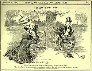 Légende: Scene à Hyde Park; ces deux personnes ne sont pas en train de communiquer l'une avec l'autre. La dame reçoit un message d'un admirateur, tandis que le monsieur reçoit les résultats des courses.