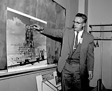 Schreiber devant une affiche du projet Rover en 1959.