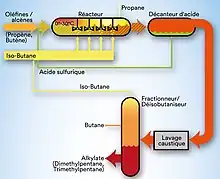 Les sous-produits du procédé RFCC sont des alcènes à chaîne courte (propylène, butylène) et des isoparaffines (isobutane), qui ne sont pas souhaitables. L'alkylation est utilisée pour convertir l'isobutane et les alcènes de faible poids moléculaire (principalement le propylène et le butylène) en alkylat, principalement l'isoheptane et l'isooctane. L'alkylate est un mélange d'essence de haute qualité car il possède de bonnes propriétés antidétonantes et brûle proprement.