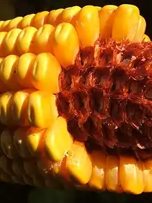 Encore tendres, les jeunes épis peuvent être consommés entièrement, mais au fur et à mesure que la plante mûrit la rafle devient plus dure jusqu'à ce que les grains deviennent la partie principalement comestible.