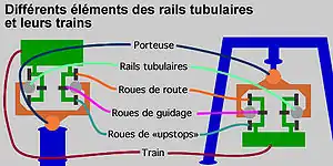 Sur ces rails, les roues de guidage s'emboîtent par l'intérieur. Ainsi, les deux cylindres sont reliés par des tiges « crochets » qui se rattachent à l'extérieur et qui se rejoignent sous le train en laissant assez d'espace pour les roues de rétention.