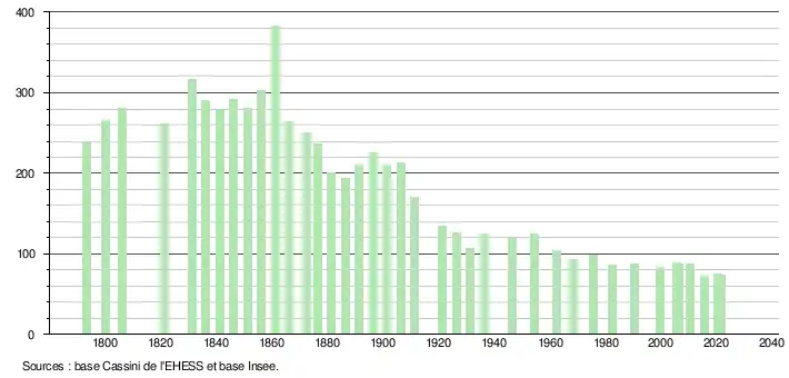 L'évolution du nombre d'habitants est connue à travers les recensements de la population effectués dans la commune depuis 1793. Pour les communes de moins de 10 000 habitants, une enquête de recensement portant sur toute la population est réalisée tous les cinq ans, les populations légales des années intermédiaires étant quant à elles estimées par interpolation ou extrapolation[23]. Pour la commune, le premier recensement exhaustif entrant dans le cadre du nouveau dispositif a été réalisé en 2005[24].