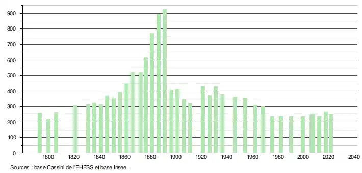 | L'évolution du nombre d'habitants est connue à travers les recensements de la population effectués dans la commune depuis 1793. Pour les communes de moins de 10 000 habitants, une enquête de recensement portant sur toute la population est réalisée tous les cinq ans, les populations légales des années intermédiaires étant quant à elles estimées par interpolation ou extrapolation[27]. Pour la commune, le premier recensement exhaustif entrant dans le cadre du nouveau dispositif a été réalisé en 2007[28]. En 2021, la commune comptait 246 habitants[Note 7], en diminution de 1,2 % par rapport à 2015 (Aude : +2,47 %, France hors Mayotte : +1,84 %). |