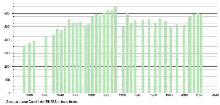 L'évolution du nombre d'habitants est connue à travers les recensements de la population effectués dans la commune depuis 1793. Pour les communes de moins de 10 000 habitants, une enquête de recensement portant sur toute la population est réalisée tous les cinq ans, les populations légales des années intermédiaires étant quant à elles estimées par interpolation ou extrapolation[22]. Pour la commune, le premier recensement exhaustif entrant dans le cadre du nouveau dispositif a été réalisé en 2007[23].