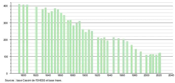 L'évolution du nombre d'habitants est connue à travers les recensements de la population effectués dans la commune depuis 1793. Pour les communes de moins de 10 000 habitants, une enquête de recensement portant sur toute la population est réalisée tous les cinq ans, les populations légales des années intermédiaires étant quant à elles estimées par interpolation ou extrapolation[14]. Pour la commune, le premier recensement exhaustif entrant dans le cadre du nouveau dispositif a été réalisé en 2005[15].