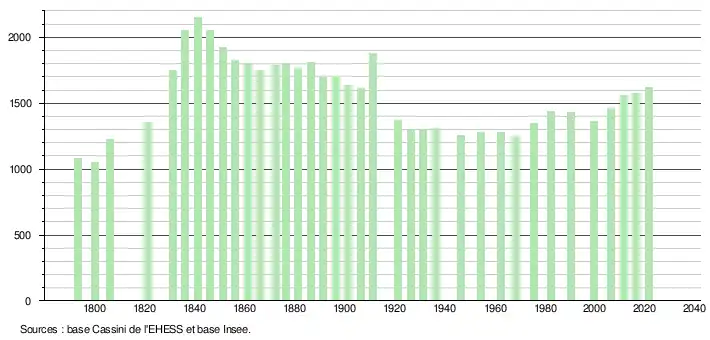 L'évolution du nombre d'habitants est connue à travers les recensements de la population effectués dans la commune depuis 1793. Pour les communes de moins de 10 000 habitants, une enquête de recensement portant sur toute la population est réalisée tous les cinq ans, les populations légales des années intermédiaires étant quant à elles estimées par interpolation ou extrapolation[42]. Pour la commune, le premier recensement exhaustif entrant dans le cadre du nouveau dispositif a été réalisé en 2006[43].