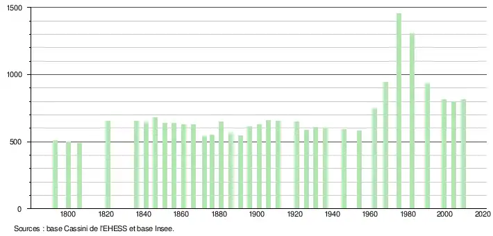 - Dans le tableau des recensements et le graphique, par convention dans Wikipédia, le principe a été retenu, pour les populations légales postérieures à 1999 de n’afficher dans le tableau des recensements et le graphique que les populations correspondant à l'année 2006, première population légale publiée calculée conformément aux concepts définis dans le décret no 2003-485 du 5 juin 2003, et les années correspondant à une enquête exhaustive de recensement pour les communes de moins de 10 000 habitants, ainsi que la dernière population légale publiée par l’Insee.