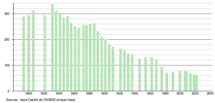 L'évolution du nombre d'habitants est connue à travers les recensements de la population effectués dans la commune depuis 1793. Pour les communes de moins de 10 000 habitants, une enquête de recensement portant sur toute la population est réalisée tous les cinq ans, les populations légales des années intermédiaires étant quant à elles estimées par interpolation ou extrapolation[14]. Pour la commune, le premier recensement exhaustif entrant dans le cadre du nouveau dispositif a été réalisé en 2008[15].